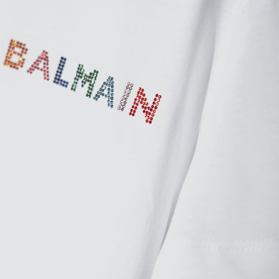 Colore: Bianco Descrizione: T-shirt bianca in cotone organico, con maniche corte e girocollo a costine. È decorata con logo Balmain di strass multicolor sul petto. Dettagli: 100% Cotone organico. Lavare a mano.