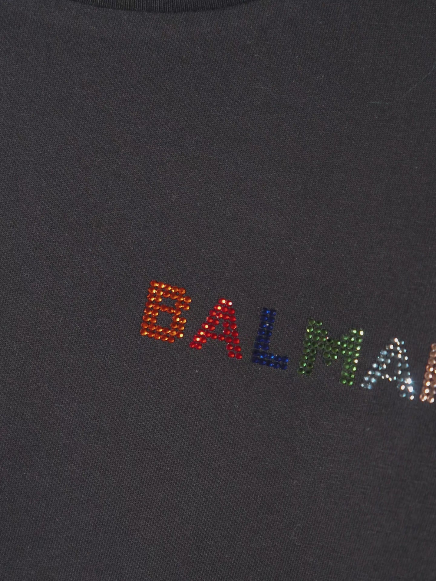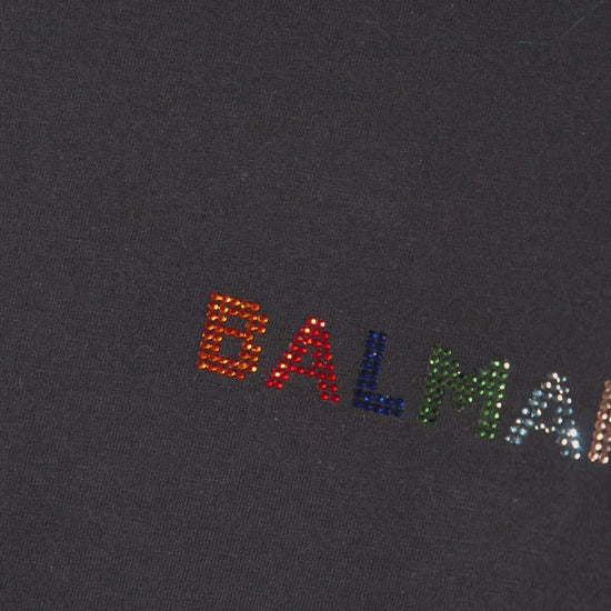 Colore: Nero Descrizione: T-shirt nera in cotone organico, con maniche corte e girocollo a costine. È decorata con logo Balmain di strass multicolor sul petto. Dettagli: 100% Cotone organico. Lavare a mano.
