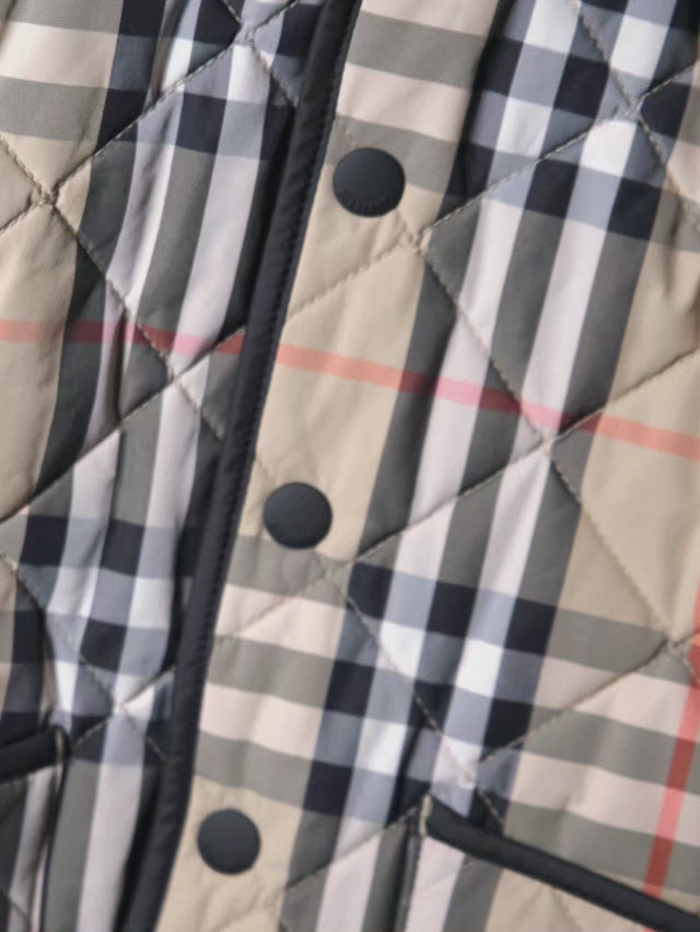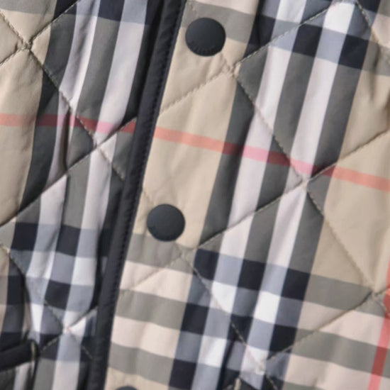 Colore: Beige Descrizione: Giubbotto beige del luxury brand Burberry Kids, leggermente imbottito e trapuntato, realizzato in morbida tela di cotone. Presenta maniche lunghe, colletto in velluto nero e pratiche tasche applicate sulla parte anteriore. Si chiude con bottoni automatici sulla parte anteriore, per una vestibilità comoda; ralizzato al 50% con materiali riciclati. È decorato con iconico check vintage. Dettagli: 100% Poliammide. Lavare a secco.