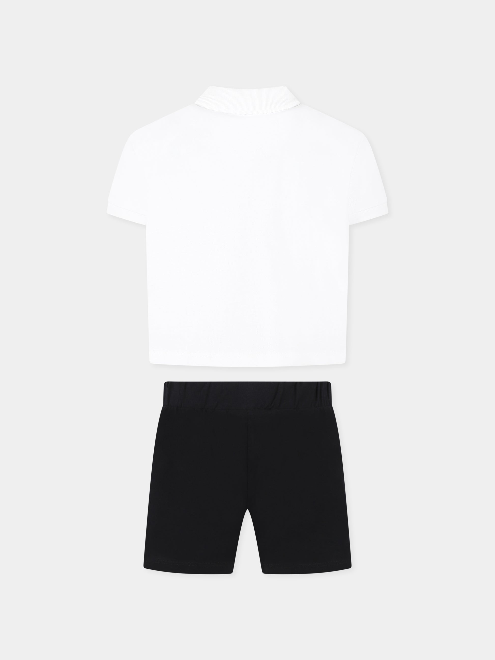 Colore: Bianco Descrizione: Completo bianco in pique di cotone, composto da polo e shorts. Polo crop a maniche corte, con colletto a punta e chiusura frontale con bottoni; decorata con logo sul petto. Shorts neri con vita elasticizzata e tasche laterali; decorati con logo su una gamba. Dettagli: 97% Cotone, 3% Elastan. Lavare a 30°C.