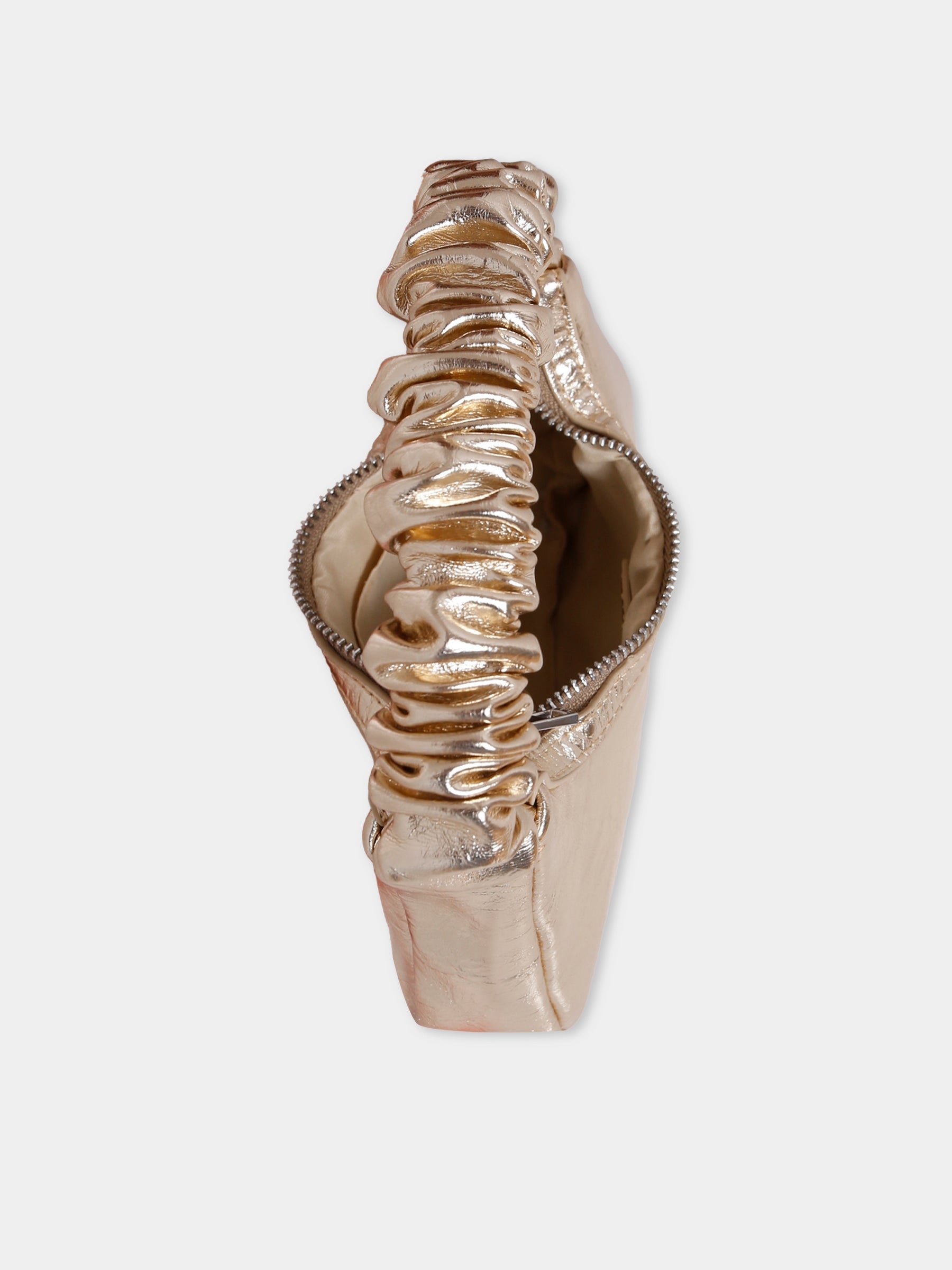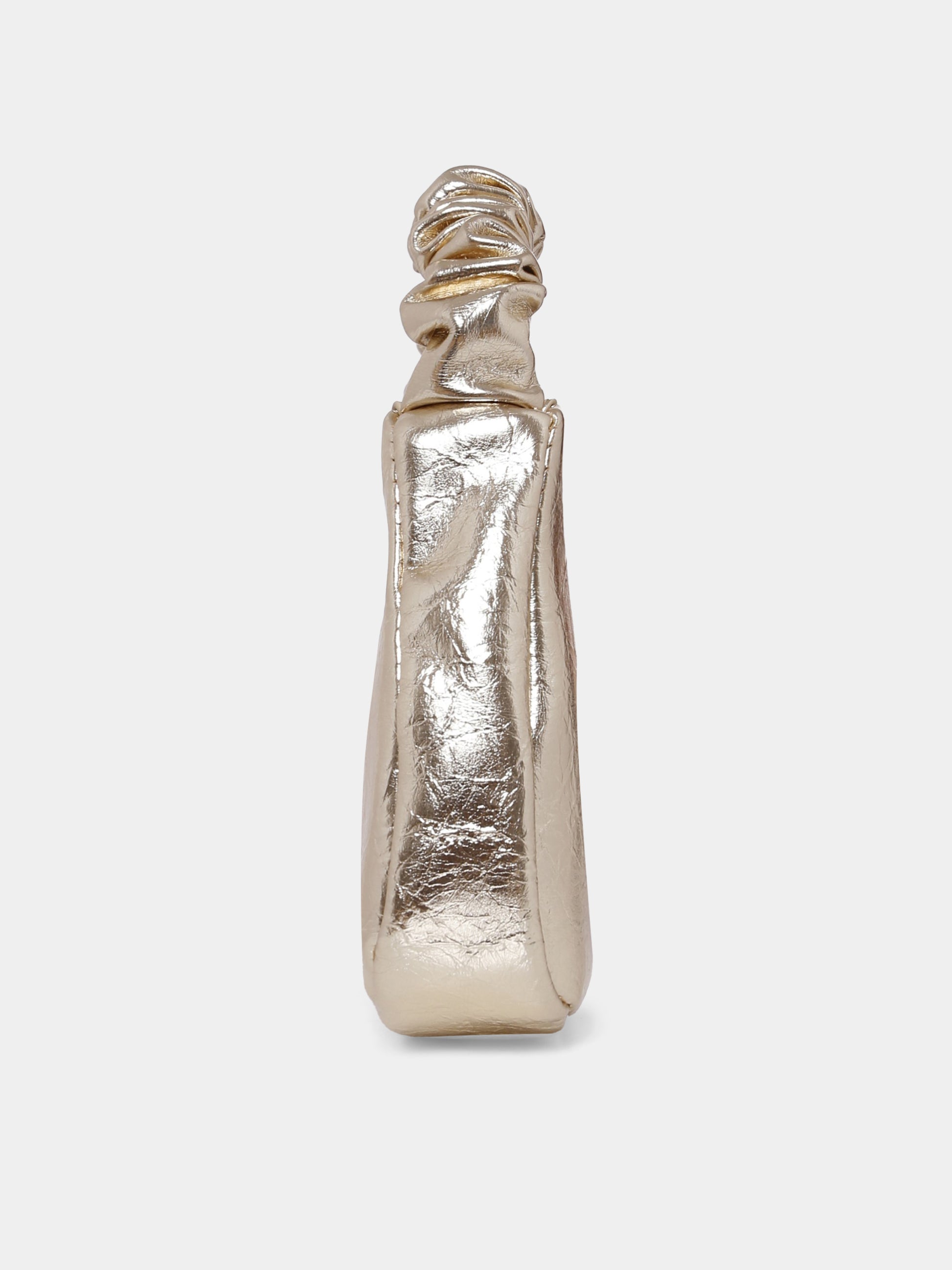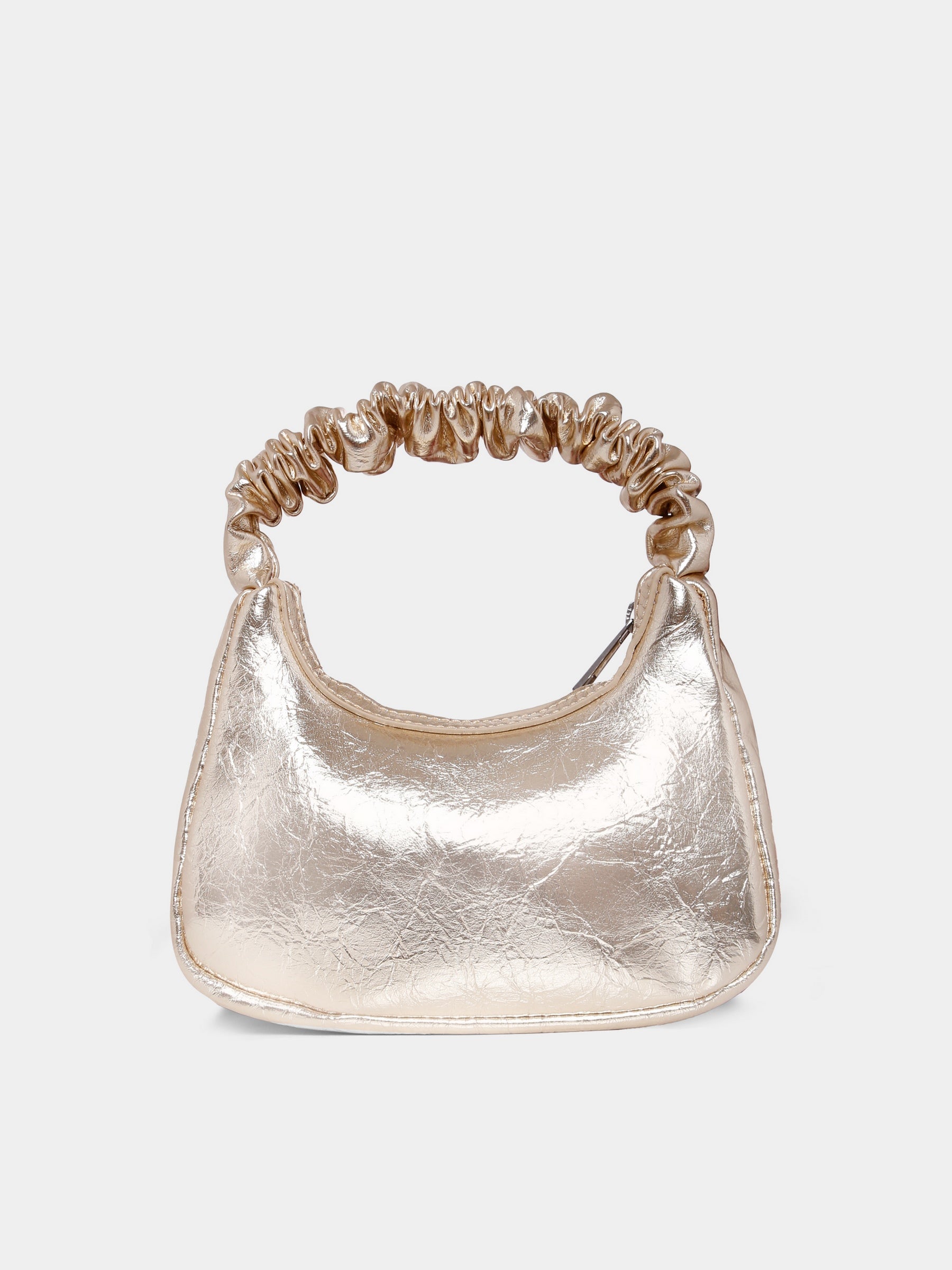 Colore: Oro Descrizione: Borsa oro effetto martellato, con manico arricciato e chiusura superiore con zip. Dimensioni (L x A x P): 21cm x15cm x4cm Dettagli: 100% Poliuretano.