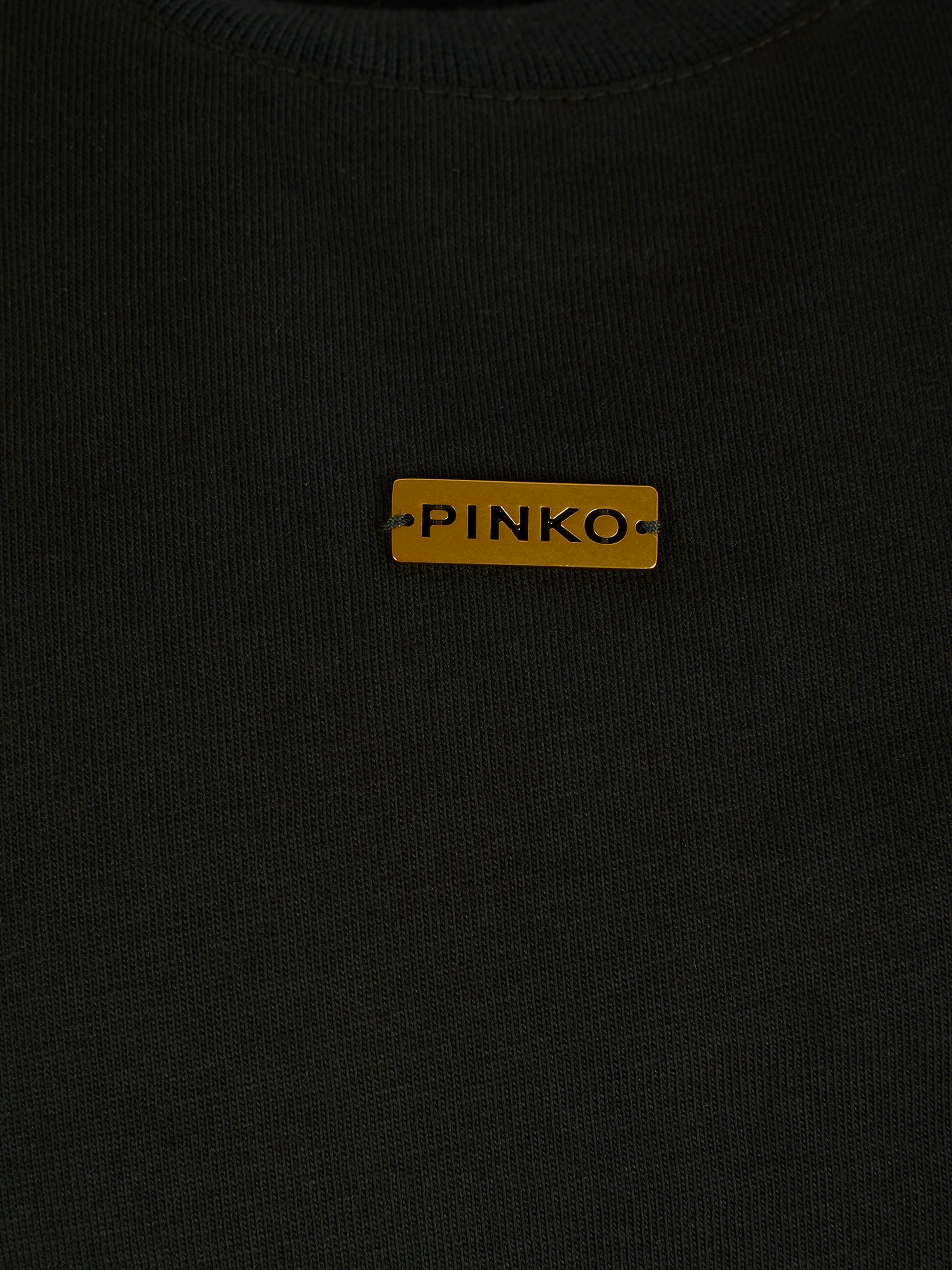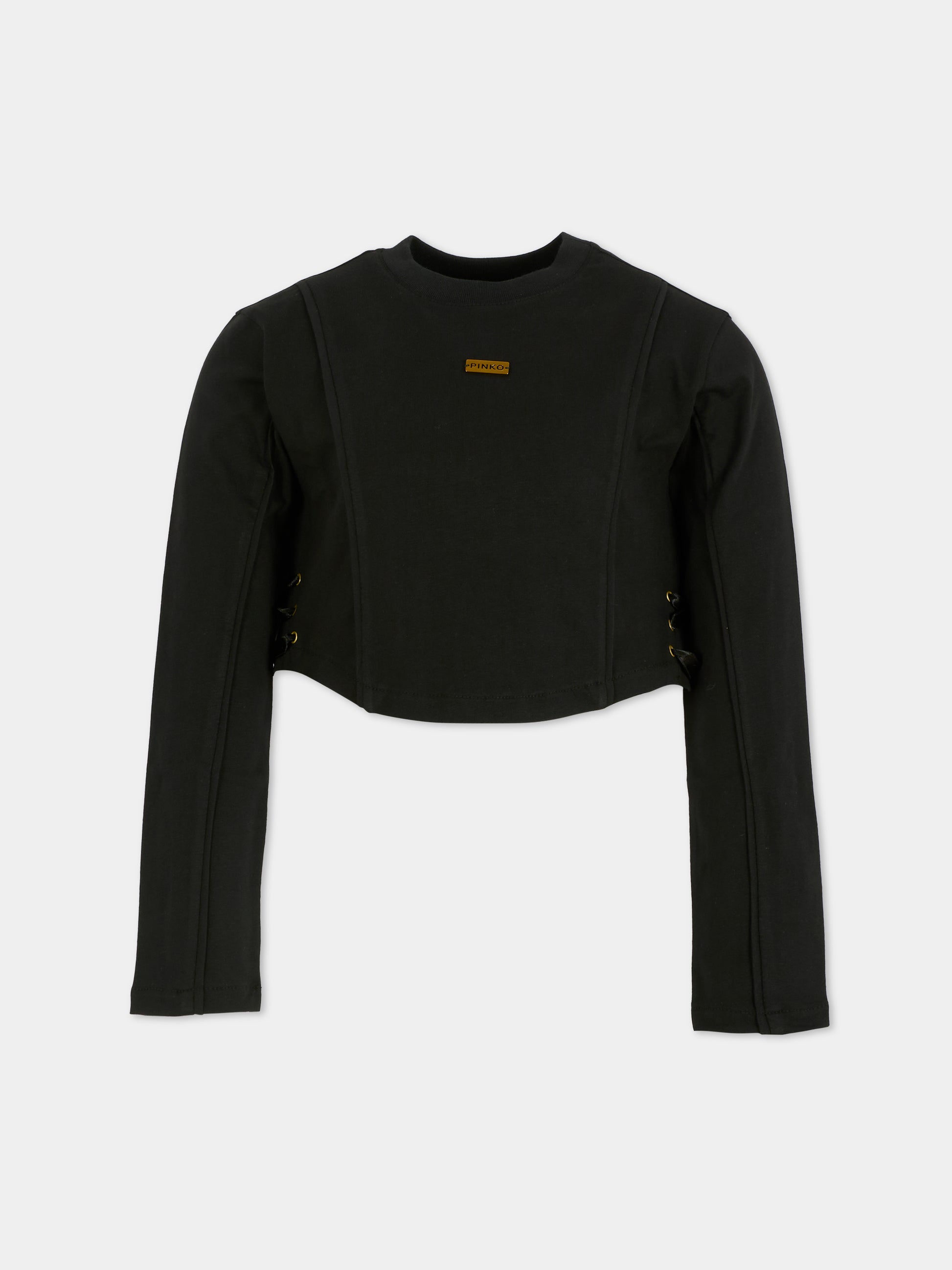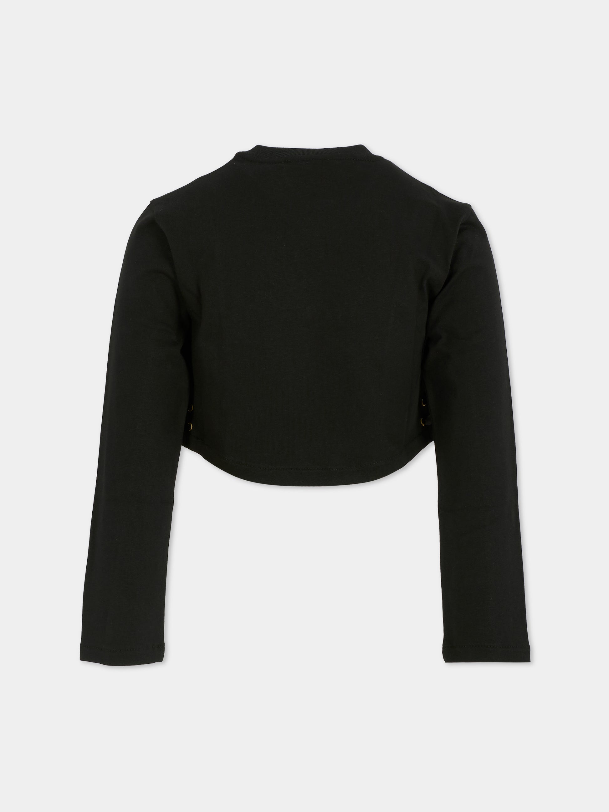 Colore: Nero Descrizione: T-shirt crop nera a maniche lunghe, con girocollo a costine e laccetti sui lati. È decorata con patch logato in metallo sulla parte anteriore. Made in Italy Dettagli: 100% Cotton. Lavare a 30°C.