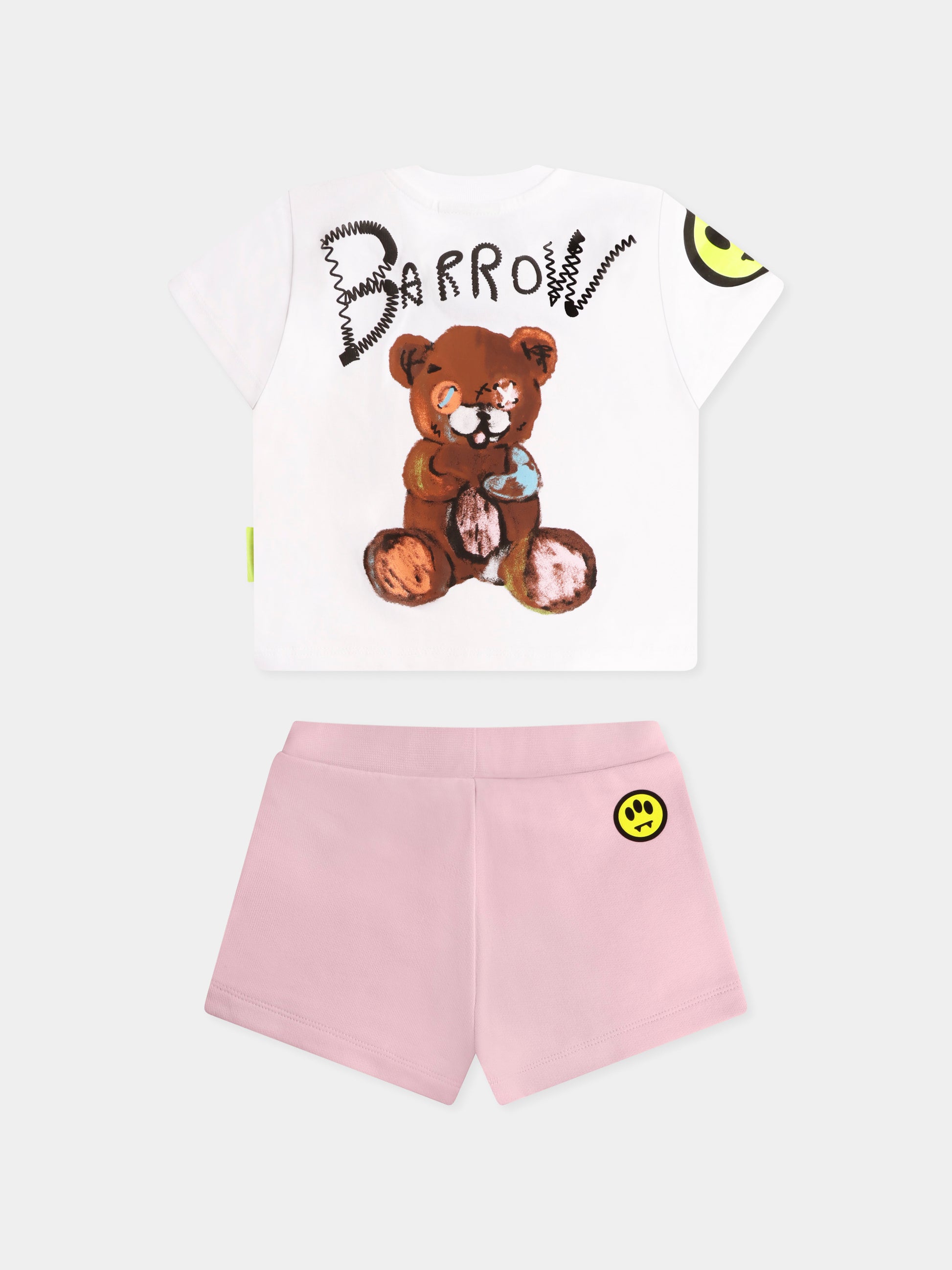 Colore: Multicolor Descrizione: Completo multicolor in cotone, composto da t-shirt e shorts. T-shirt bianca a maniche corte, con girocollo a costine e chiusura con bottoni automatici sulla spalla; decorata con logo frontale, iconico smile giallo su una manica e stampa Bear sul retro. Shorts rosa in cotone garzato, con vita elasticizzata; decorati con smile sul retro. È dotato di portachiavi giallo logato. Dettagli: 100% Cotone. Lavare a mano.