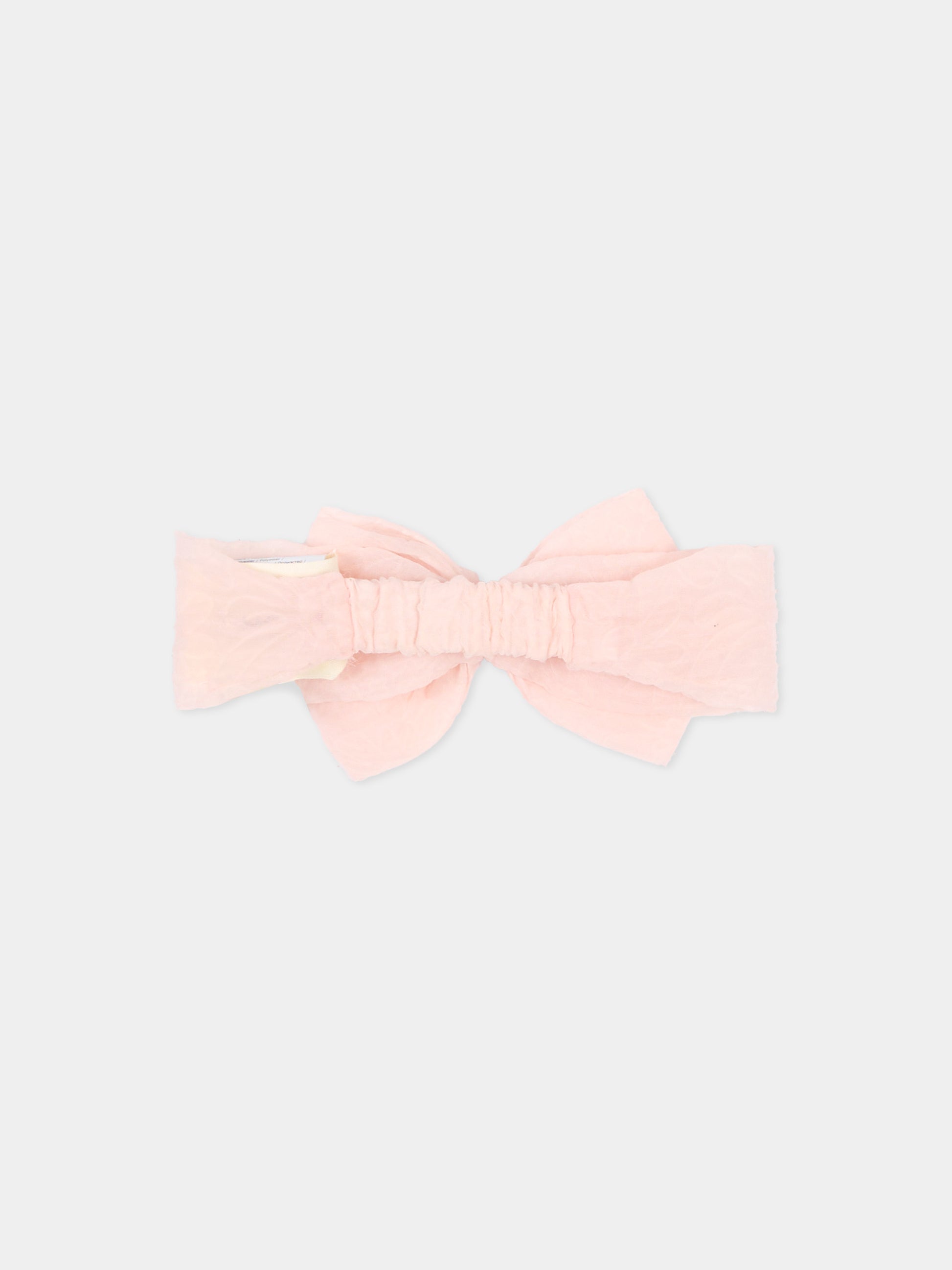 Fascia rosa Simonetta in tessuto leggero con delicata lavorazione a fiori incisi, pensata per avvolgere con morbidezza la testa della neonata. L’ampio fiocco centrale tono su tono aggiunge un accento bon ton mantenendo un’estetica essenziale. La banda elasticizzata assicura una tenuta confortevole, mentre il motivo floreale inciso dona al fiocco una resa raffinata e discreta.