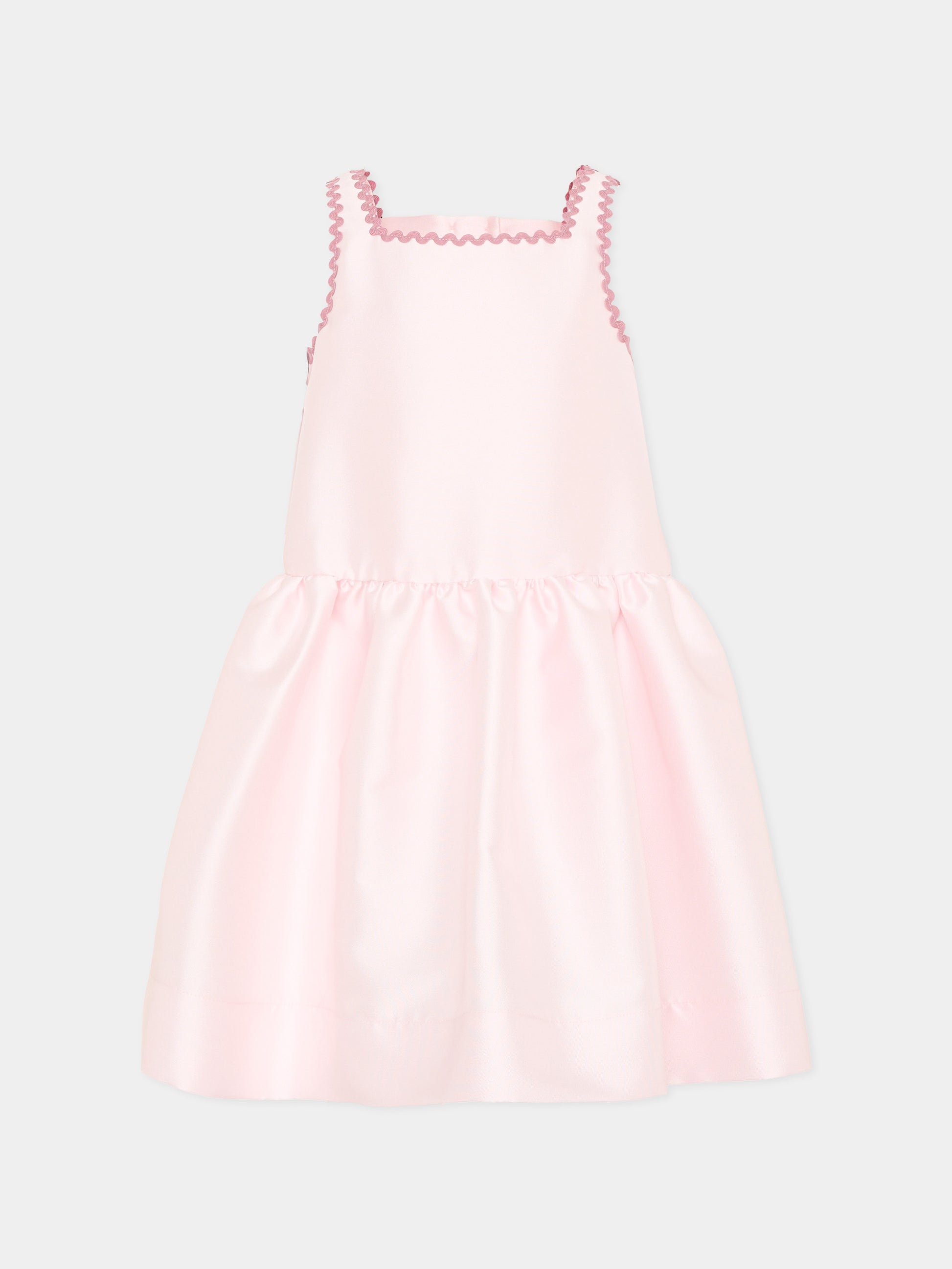 Abito elegante rosa Simonetta in tessuto lucido dalla mano morbida con linea svasata e volume leggero. Bretelle sottili incorniciano lo scollo squadrato rifinito da passamaneria a ondina in tono più intenso, dettaglio che ritorna sul retro intorno allo scollo cut out. Gonna arricciata in vita che crea una silhouette ampia, sostenuta dall’interno interamente foderato in cotone per maggiore comfort a contatto con la pelle. Insieme di volumi morbidi e profili ondulati che valorizza l’attitudine bon ton del modello.
