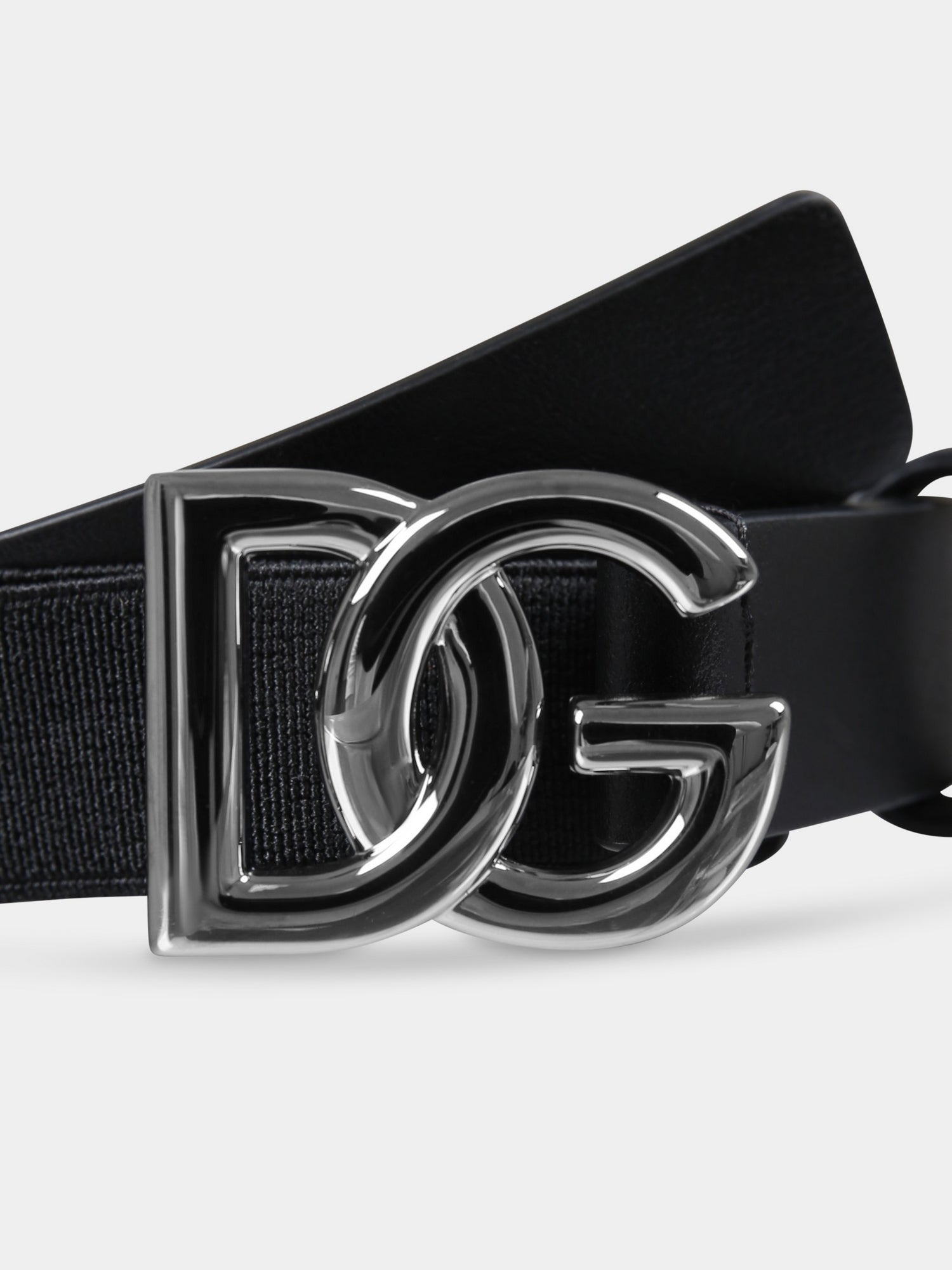 Colore: Nero Descrizione: Cintura nera del luxury brand italiano Dolce & Gabbana Kids, perfetta per un look elegante e riconoscibile, presenta una fibbia in metallo argento con logo DG. Ha finiture in pelle ed é elasticizzata per il massimo comfort. Made in Italy Dettagli: 55% Poliestere, 40% Pelle, 5% Elastan.