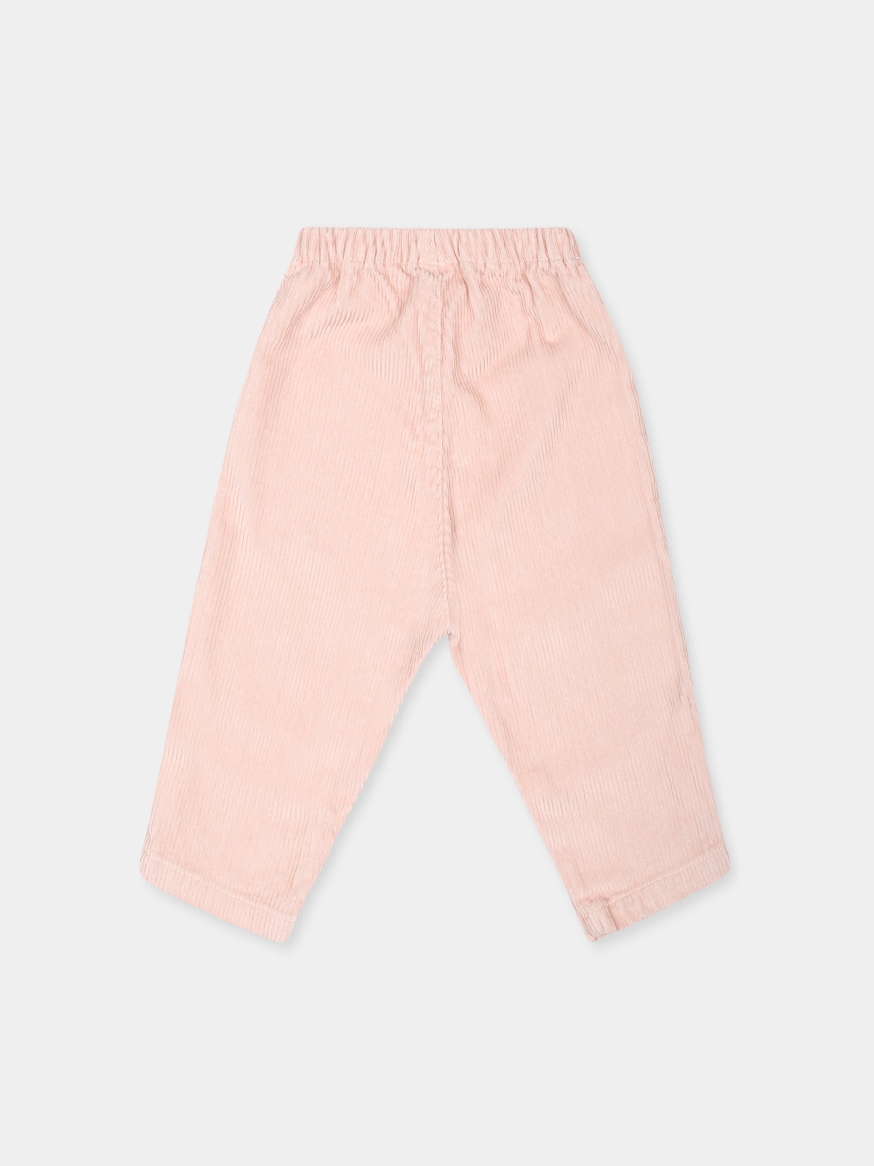 Colore: Rosa Descrizione: Pantaloni rosa in velluto a costine, con vita elasticizzata; realizzati con cotone organico. Sono decorati con patch logato sul lato. Dettagli: 100% Cotone organico. Lavare a 30°C.