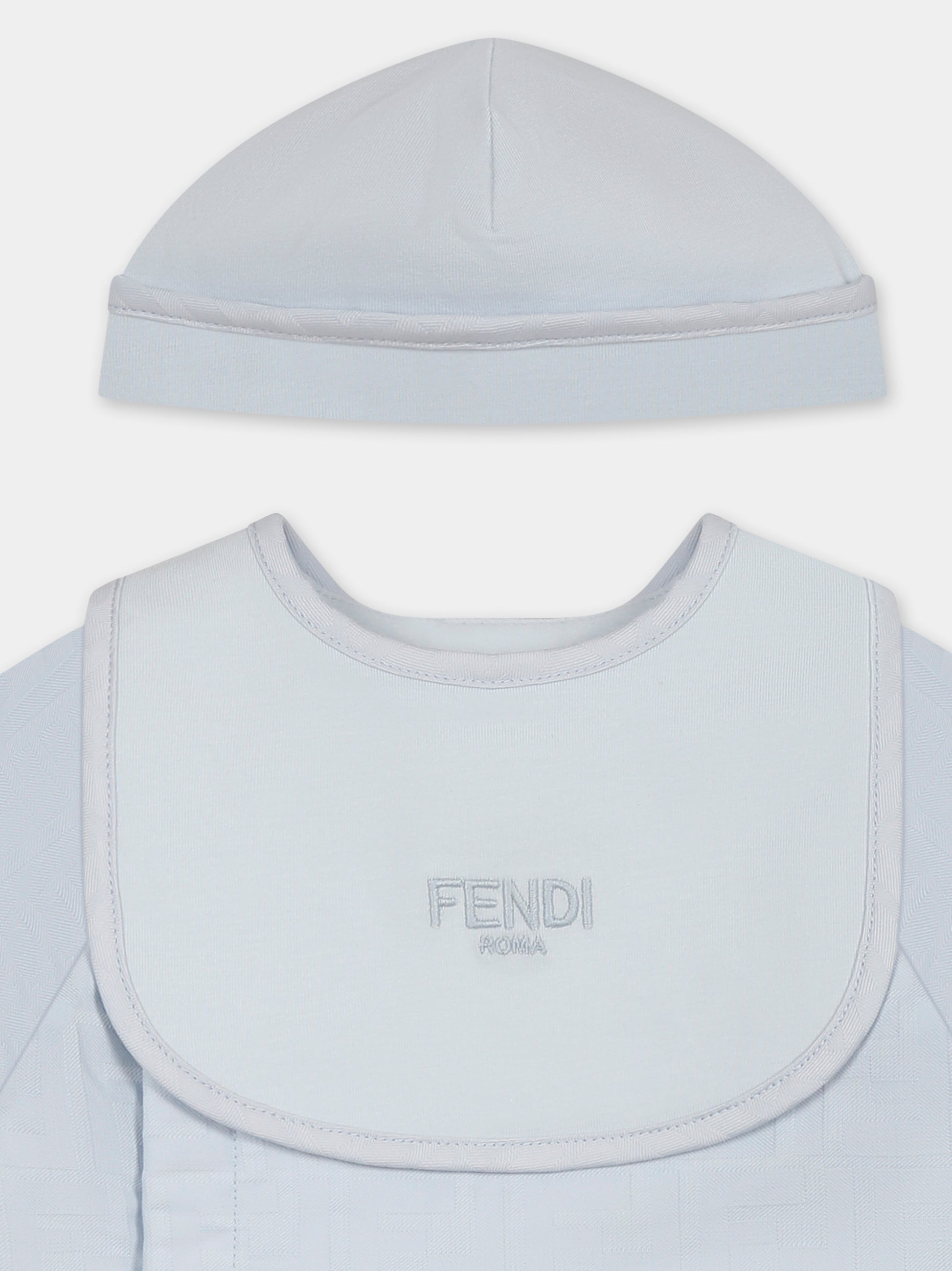Colore: Celeste Descrizione: Set tutina celeste del luxury brand italiano Fendi Kids, realizzato in cotone, composto da tutina, bavaglino e cappello. Tutina a maniche lunghe, con parte superiore leggermente imbottita, scollo rotondo, chiusura fontale con bottoni automtaici sulla parte anteriore e piedini. È decorata con iconica FF all-over. Bavaglino con bottone automatico sul retro; é decorato con logo Fendi Roma ricamato sulla parte anteriore. Made in Italy Dettagli: 100% Cotone. Lavare a secco.
