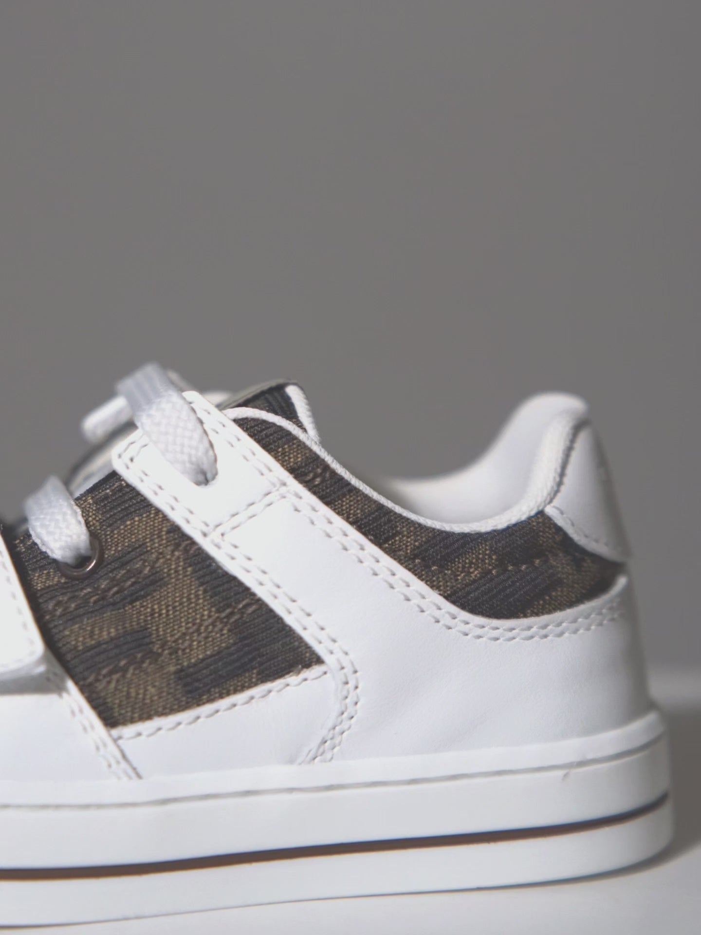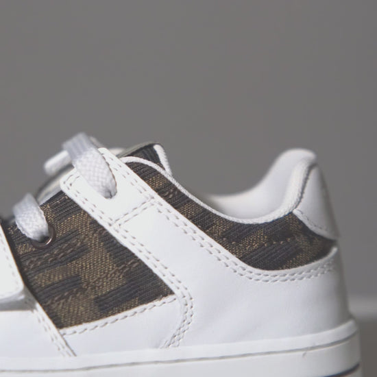 Colore: Bianco Descrizione: Sneakers bianche del luxury brand Fendi Kids, realizzate in pelle e tessuto jacquard, con suola in gomma, chiusura a strappo sulla parte anteriore, lacci e punta tonda. Sono decorate con logo sulla parte anteriore e iconica FF color tabacco. Made in Italy Dettagli: 50% Pelle, 50% Tessuto.