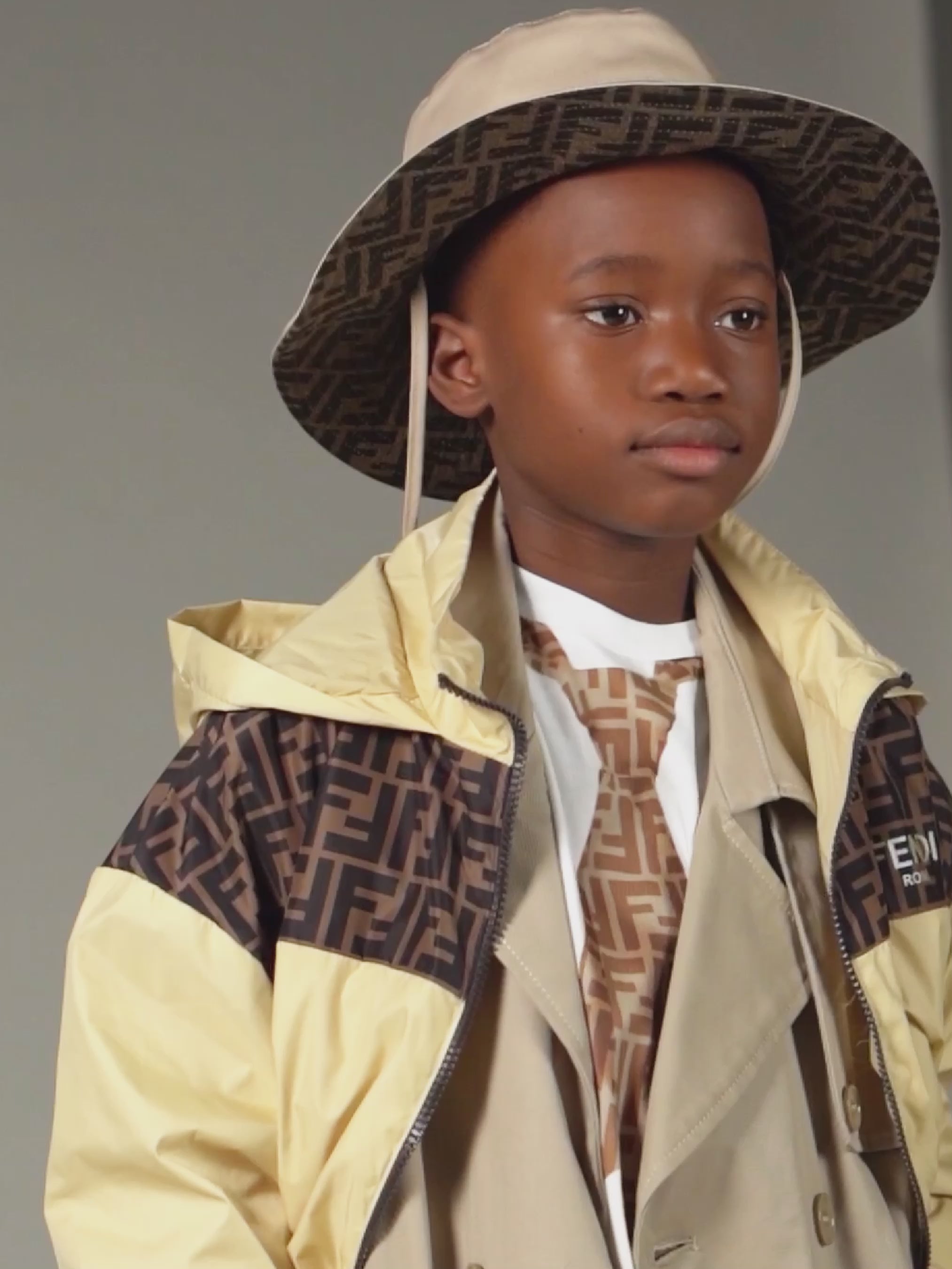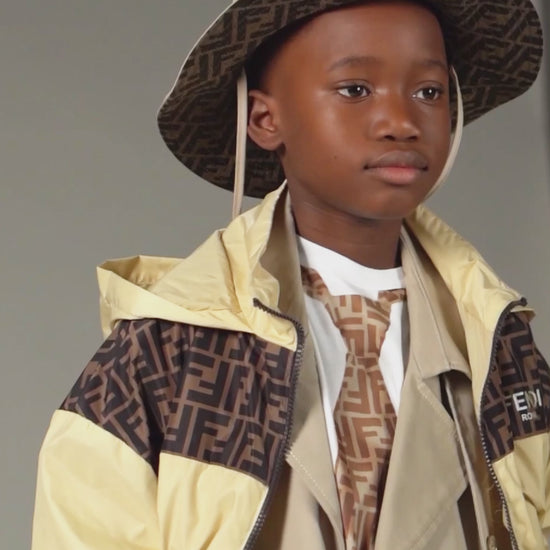 Colore: Beige Descrizione: Giacca a vento beige del luxury brand Fendi Kids, in tessuto leggero. Questo modello a maniche lunghe, presenta cappuccio, chiusura frontael con zip, tasche laterali, polsini elasticizzati e orlo con coulisse. È decorata con iconica FF color tabacco sulla parte superiore e logo Fendi Roma sul petto. Made in Italy Dettagli: 100% Poliammide. Lavare a ano.