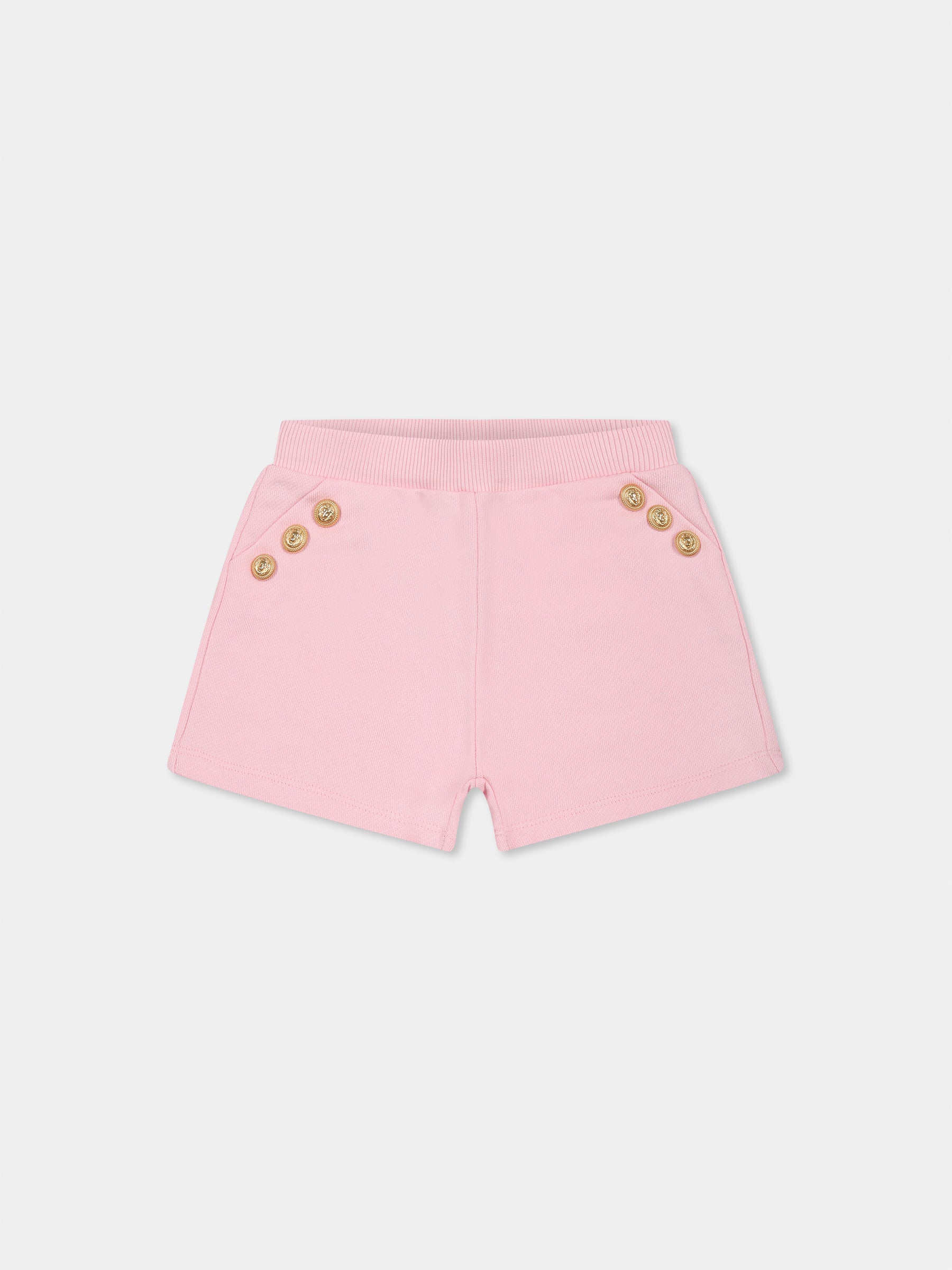 Colore: Rosa Descrizione: Shorts rosa realizzati in cotone garzato, con banda in vita a costine elasticizzata. Sono decorati con iconici bottoni dorati laterali. Dettagli: 100%Cotone. Lavare a mano.