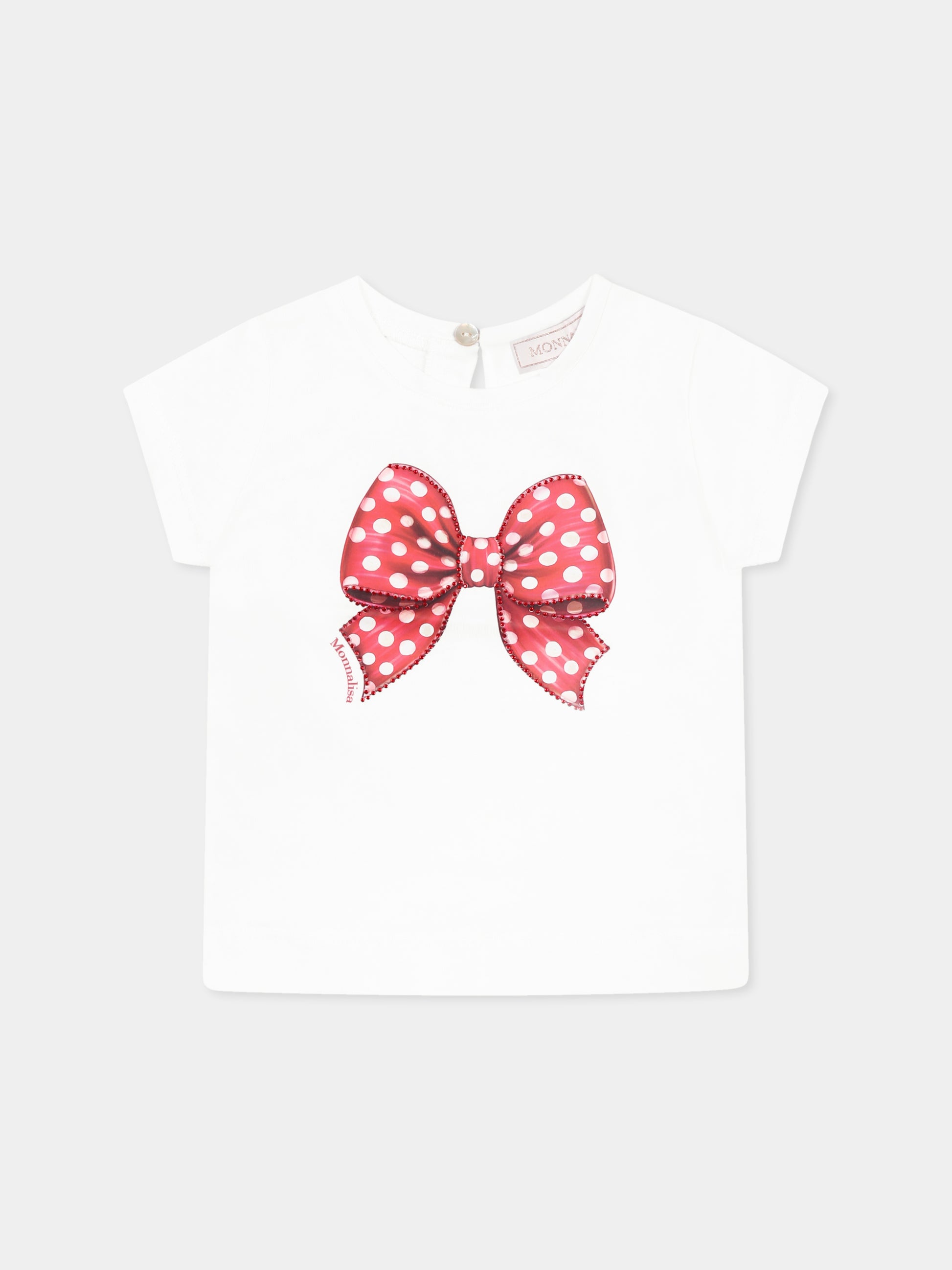 Colore: Bianco Descrizione: T-shirt bianca in cotone, a maniche corte, con girocollo a costine e chiusura con bottone sul retro. È decorata con fiocco rosso a pois e strass sulla parte anteriore. Dettagli: 100% Cotone. Lavare a 30°C.