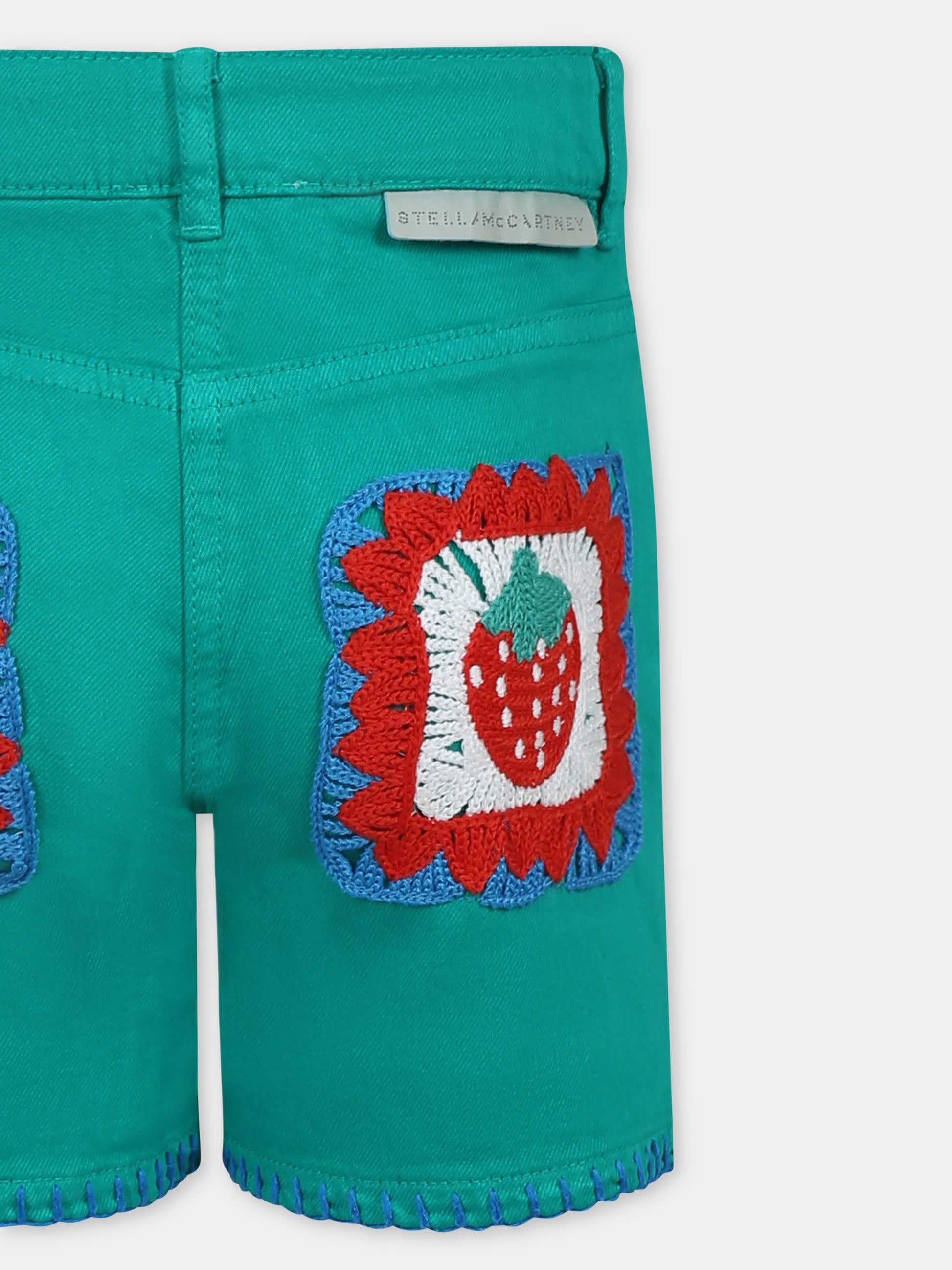 Colore: Verde Descrizione: Shorts verdi cinque tasche, in misto cotone organico certificato GOTS, con passanti per cintura, chiusura frontale con zip e gancio, vita regoalbile grazie ad elastico inetrno con bottoni eorlo con dettagli ricamati. Sono decorati con fragola crochet sul retro e patch logata. Dettagli: 98% Cotone organico, 2% Elastan. Lavare a 30°C.