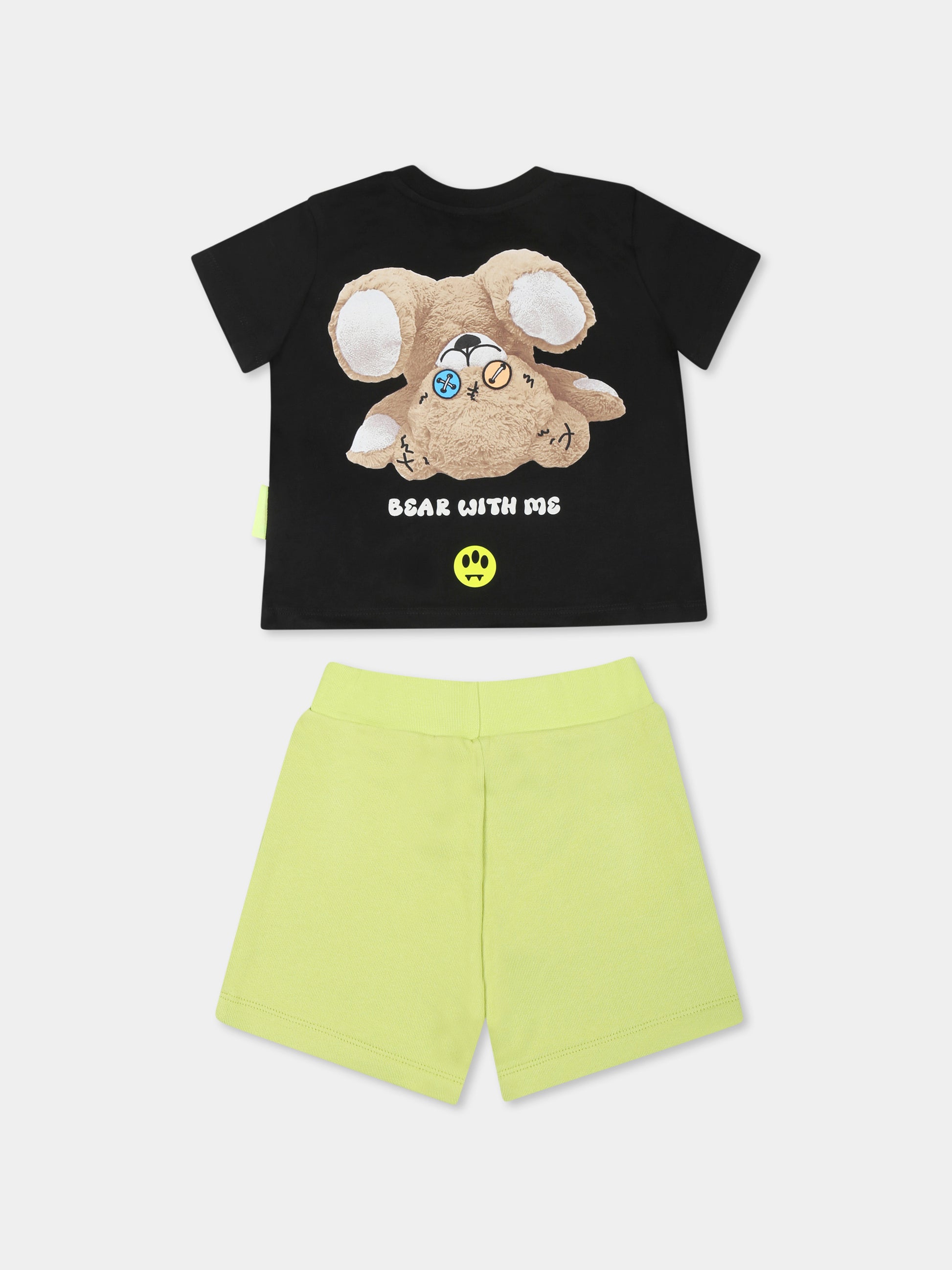 Colore: Multicolor Descrizione: Completo multicolor in cotone composto da t-shirt e shorts. T-shirt nera a maniche corte, con girocollo a costine e chiusura con bottoni automatici sulla spalla. È decorata con logo frontale e con stampa Bear sul retro. Shorts verdi in cotone garzato, con vita elasticizzata. Sono decorati con stampa Bear sulla gamba. È dotato di portachiavi giallo logato. Dettagli: 100% Cotone. Lavare a mano.